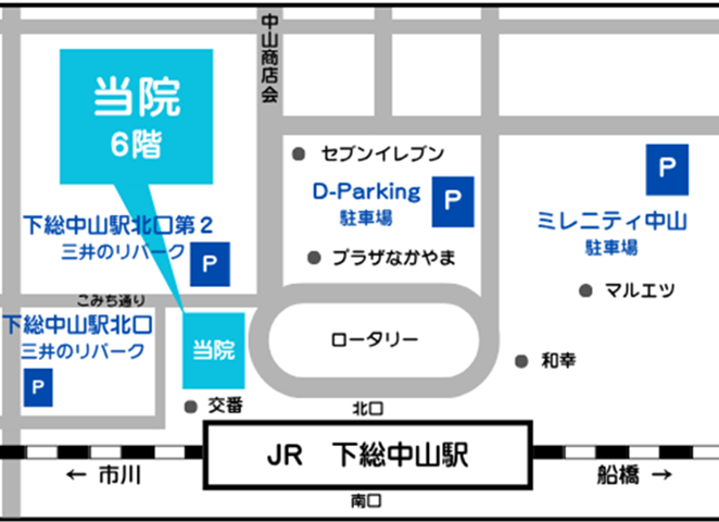 アクセス JR下総中山駅北口を出て、左手目の前にあるビルの6階・徒歩0分
