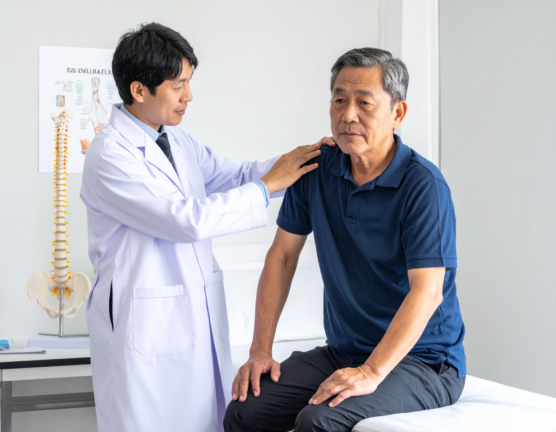 肩の痛み・肩こりとは 肩の痛みを引き起こす主な疾患 肩の痛み・肩こりの診断と検査 肩の痛み・肩こりの予防法 当院での治療方法 当院のこだわり 料金について よくある質問 肩の痛み・肩こりとは 肩の痛みの特徴と日常生活への影響 肩の痛みは、日常生活の様々な場面で支障をきたす症状です。服を着替える動作、洗濯物を干す動作、髪を洗う動作など、腕を上げる動きが困難になることがあります。 肩関節は人体の中で最も動きの大きい関節です。前後左右に加え、回旋運動も可能な複雑な構造をしています。この可動域の広さゆえに、様々な原因で痛みが生じやすくなります。 肩の痛みの原因は多岐にわたります。関節自体の問題、筋肉や腱の損傷、神経の圧迫など、痛みの部位や動作によって原因となる疾患が異なります。適切な診断により、原因を特定することが治療の第一歩となります。 肩の痛みが長引く、腕が動かしにくいといった症状がある際は、住まいに関わらず早めの診察を受けていただくことが大切です。当院では遠方からの患者さまも歓迎しております。 肩こりのメカニズム 肩こりは、首から肩、背中にかけての筋肉が緊張し、重だるさや痛みを感じる状態です。多くの方が経験される身近な症状ですが、放置すると慢性化し、頭痛や吐き気を伴うこともあります。 デスクワークやスマートフォンの使用など、長時間同じ姿勢を続けることで、肩周りの筋肉に持続的な負担がかかります。筋肉が緊張すると血流が悪くなり、疲労物質が蓄積することで、さらに筋肉が硬くなるという悪循環が生じます。 ストレスによる筋肉の緊張も、肩こりの大きな原因です。精神的な緊張が続くと、無意識に肩に力が入り、筋肉が硬くなります。寒い環境も筋肉を収縮させるため、肩こりを悪化させる要因となります。 また、眼精疲労や歯の噛み合わせの問題、内臓の疾患が原因で肩こりが生じることもあります。長期間続く肩こりや、他の症状を伴う場合は、医師の診察を受けることが大切です。 肩の痛みを引き起こす主な疾患 四十肩・五十肩(肩関節周囲炎) 四十肩・五十肩は、40代や50代に多く発症することから、このような名前がついています。正式には「肩関節周囲炎」と呼ばれます。 肩関節を包む関節包や、周囲の筋肉、腱などに炎症が生じ、痛みと可動域の制限が現れます。発症のきっかけは明確でないことが多く、徐々に症状が現れます。 症状は段階的に進行します。初期の「急性期」では、安静時にも強い痛みが生じ、夜間痛により眠れないこともあります。この時期は炎症が強く、無理に動かすと症状が悪化します。 次の「拘縮期」では、痛みは落ち着いてきますが、肩の動きが制限されます。腕を上げられない、後ろに回せないなど、日常生活に支障をきたします。 最後の「回復期」では、徐々に可動域が改善していきます。適切なリハビリテーションにより、機能回復を促すことが重要です。 発症から回復までには、通常1年から2年程度かかりますが、適切な治療により、症状を軽減し、回復を早めることができます。 肩腱板損傷 肩腱板は、肩関節を安定させる4つの筋肉の腱で構成されています。この腱が部分的または完全に断裂した状態が肩腱板損傷です。 転倒して手をついた際や、重い物を持ち上げた際など、外傷により生じることがあります。また、加齢による腱の変性が進んでいる場合、日常的な動作でも断裂することがあります。 腕を上げる際に痛みが生じ、特に腕を横から上げる動作が困難になります。夜間に肩が痛んで目が覚めることもあります。筋力低下により、腕を持ち上げ続けることが難しくなることも特徴です。 超音波検査やMRI検査により、腱の断裂の有無や程度を確認できます。部分断裂の場合は保存的治療を行い、完全断裂で症状が重度の場合は、手術が必要になることがあります。 石灰沈着性腱炎 石灰沈着性腱炎は、肩腱板にカルシウムが沈着し、急性の炎症を起こす疾患です。 突然の激しい痛みが特徴で、動かすことはもちろん、じっとしていても強い痛みが続きます。夜間に突然発症することも多く、痛みで眠れないほどの苦痛を伴います。 レントゲン検査により、腱の中に白い石灰の沈着を確認できます。40代から50代の女性に多く見られます。 急性期には、消炎鎮痛薬や注射により痛みを和らげます。痛みが強い場合には、体外衝撃波治療が非常に効果的です。衝撃波により石灰を砕き、吸収を促進することで、症状の改善が期待できます。 変形性肩関節症 変形性肩関節症は、肩関節の軟骨がすり減り、骨同士が直接ぶつかることで痛みが生じる疾患です。 加齢による変化や、過去の外傷、肩腱板の大きな断裂などが原因となります。動かし始めに痛みが強く、動かしているうちに痛みが軽減することがあります。進行すると、安静時にも痛みが生じるようになります。 レントゲン検査により、関節の隙間が狭くなっていることや、骨棘の形成など